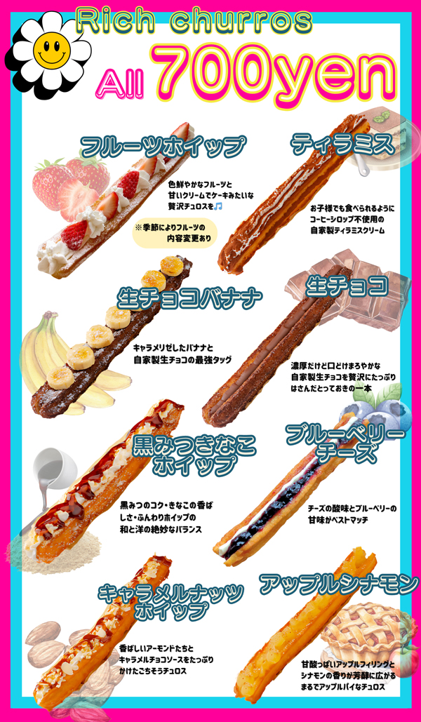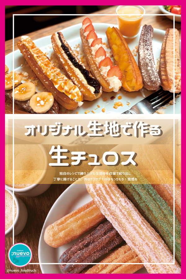 店名の”nuevo”(ヌエボ)はスペイン語で【新しい】といった意味で、スペイン発祥のチュロスを全く新しい形で美味しく楽しく食べていただきたく名付けて始めました。